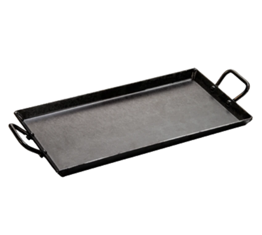 Griddle, 21-2/5″ x 10-1/2″ x 2-7/10″H (exterior), 18″ x 10″ cooking surface, (2) riveted steel handles, stove top/induction/grill/campfire/oven safe, seasoned with oil, hand wash only, heavy gauge carbon steel, Made in USA