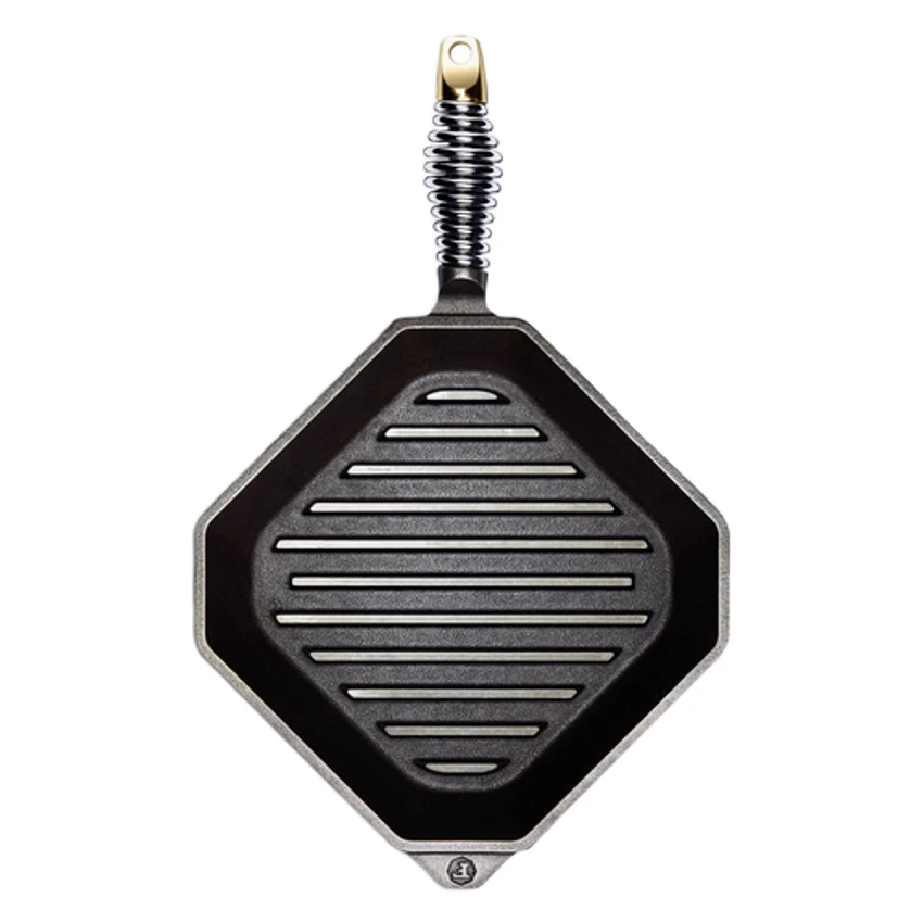 Finex® Grillet Pan, 10″ x 3-1/4″H, 18-1/4″ OAL, octagonal/square, grooved surface, refrigerator/gas/electric/ceramic/induction/stove top/grill/campfire/oven safe, hand wash only, pre-seasoned, stainless steel spring handle, cast iron