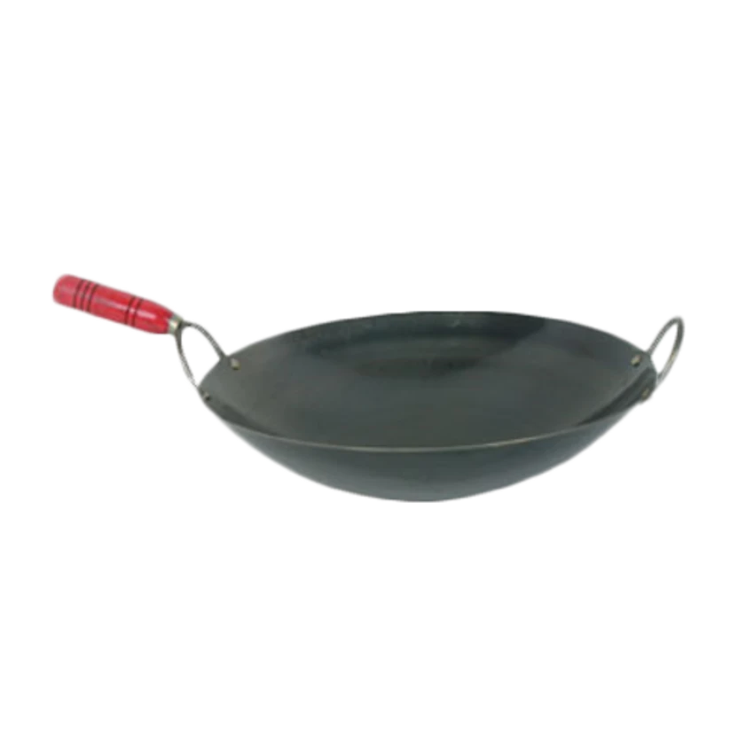 Wok, 16″ dia., 2 riveted round handles, 1 with wood, iron