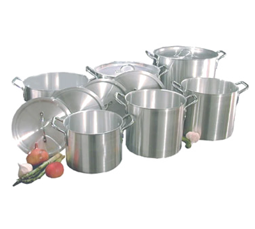 Stock Pot Set, 12 piece, includes: (1) 8 quart, (1) 12 quart, (1) 16 quart, (1) 18 quart, (1) 24 quart, (1) 36 quart, each with a cover, riveted loop handles, medium commercial weight, aluminum construction