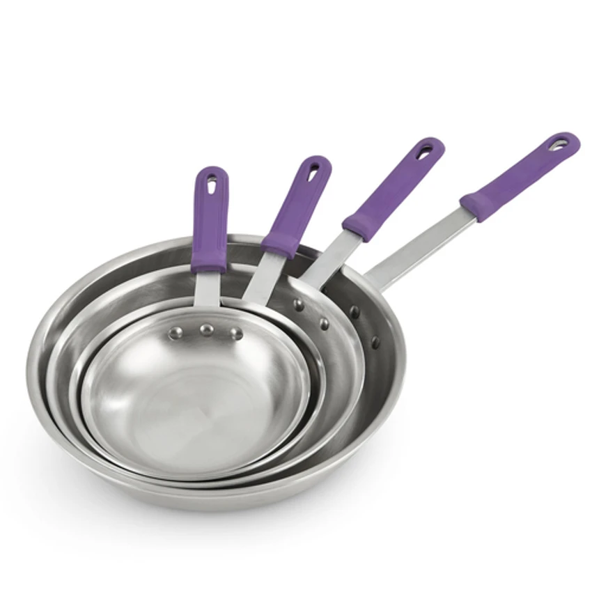 Wear-Ever® Aluminum Fry Pan, 8″ (20 cm), with Natural Finish, featuring removable purple silicone insulated handle & innovative EverTite™ Riveting System, handle rated at 450° for stovetop or oven use, 5-3/4″ (14 cm) bottom diameter, 1-7/8″ (4.8cm) inside height, 10 ga., NSF, Made in USA