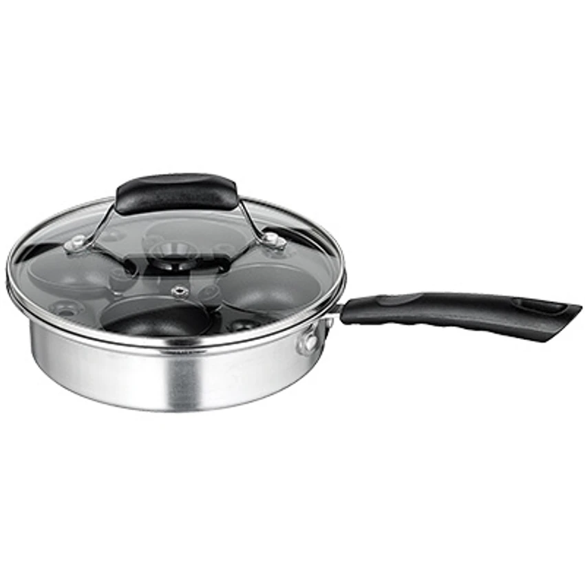 Egg Poacher, 8″ dia. x 3-1/3″H, non-stick, includes: tempered glass lid, sauce pan, and tray, (4) cups with cool touch handles, induction ready, dishwasher safe, stainless steel, non-stick coating